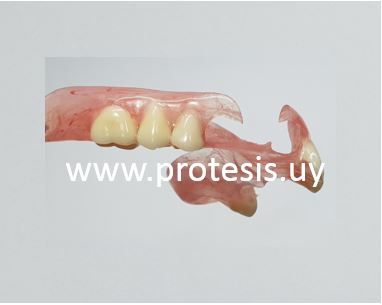 Prótesis dentales flexibles Uruguay, Una dentadura flexible (prótesis parcial flexible) realizada para un paciente Para el caso de un maxilar superior esta foto muestra una