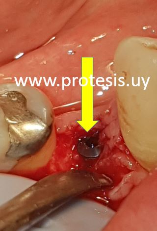 Implante dental colocado en el maxilar superior indicado con flecha amarilla