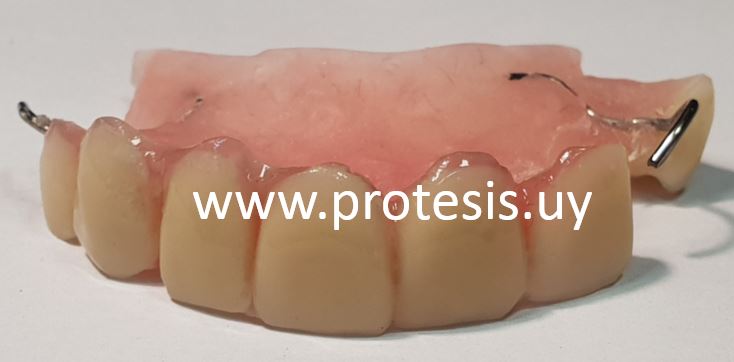 Prótesis dental parcial de 2 piezas dentales con paladar transparente.