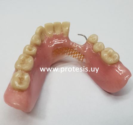 Foto de una prótesis dental reparada con una malla de metal.
